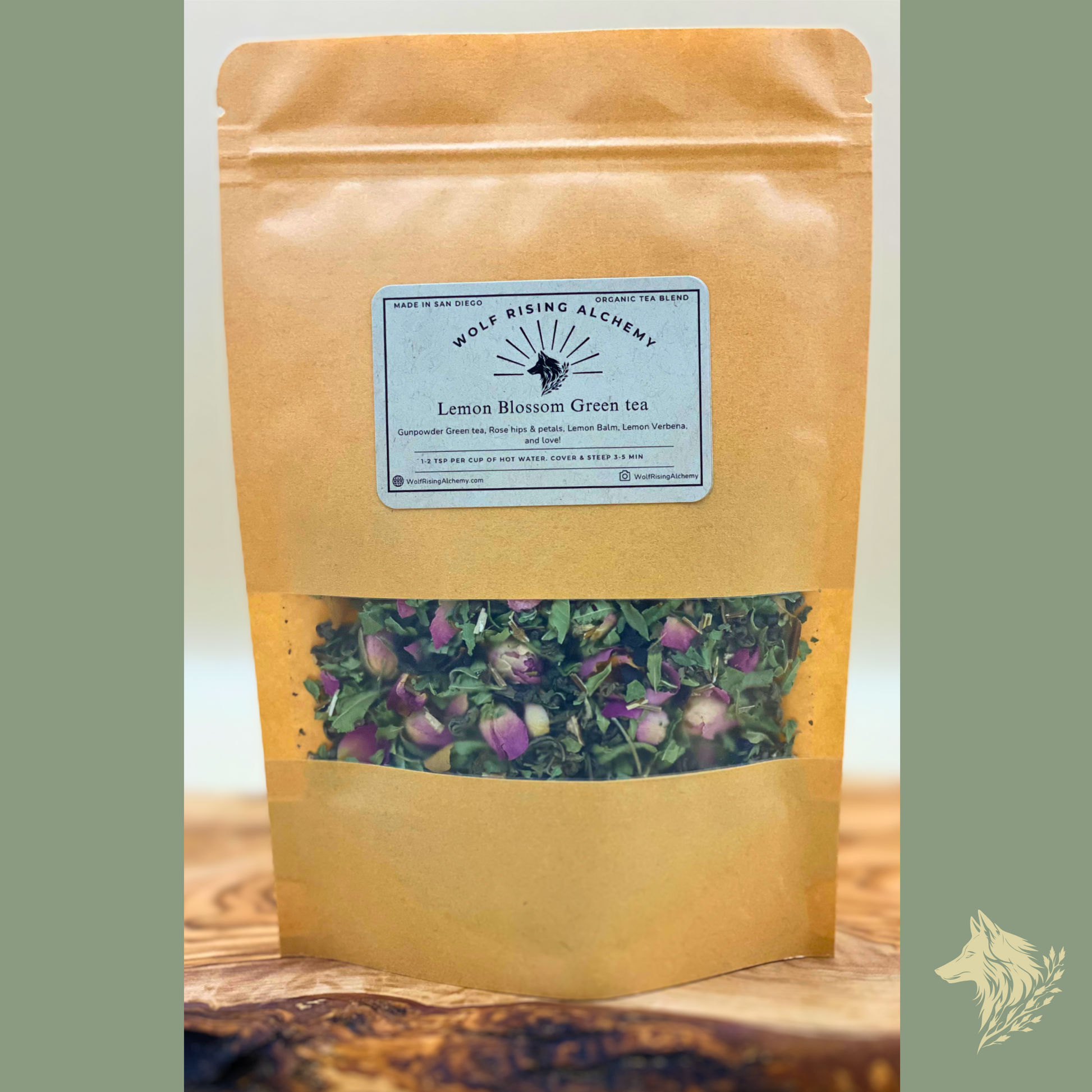 A delicate yet invigorating blend, Lemon Blossom Green Tea is crafted to awaken the senses and soothe the soul. This harmonious infusion combines the bold, slightly smoky depth of gunpowder green tea with the bright, citrusy notes of lemon balm and lemon verbena. The addition of rose hips and petals lends a floral sweetness, while providing a nourishing boost of antioxidants. Perfect for a mindful morning ritual or an afternoon moment of serenity, this tea supports digestion, relaxation, and overall well-being.